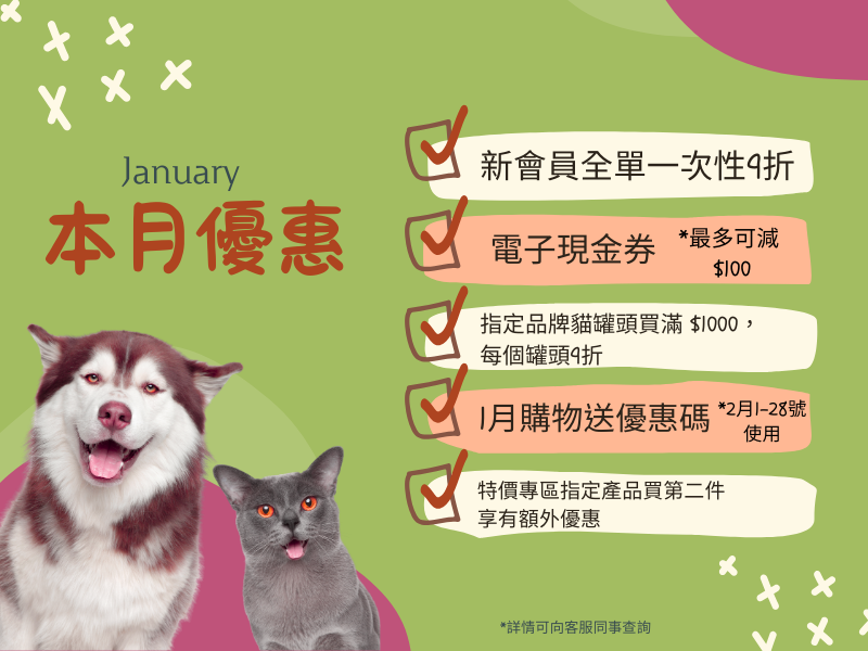 只要寵物用品訂單達以下指定金額(折實後),顧客便可獲贈電子現金券,以待於下張訂單用上。
