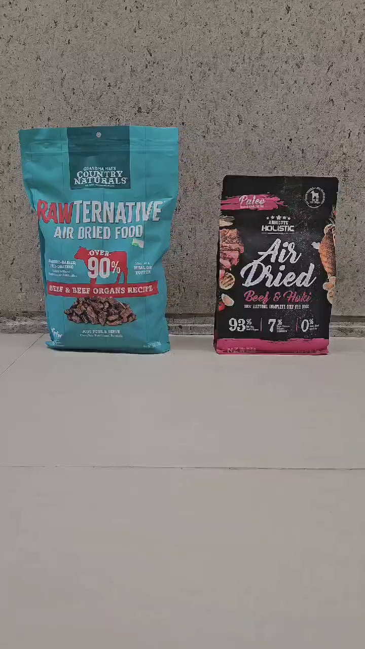 絕對整體風乾產品在72攝氏度至80攝氏度(攝氏度)之間的溫度下經過10個小時的緩慢脫水。溫度非常低,以確保我們不烹飪肉類的天然食品。通過風乾食物,天然成分中包含的蛋白質,維生素,營養素和酶保持完整。此過程使您的狗保留了生食飲食的所有營養益處。
